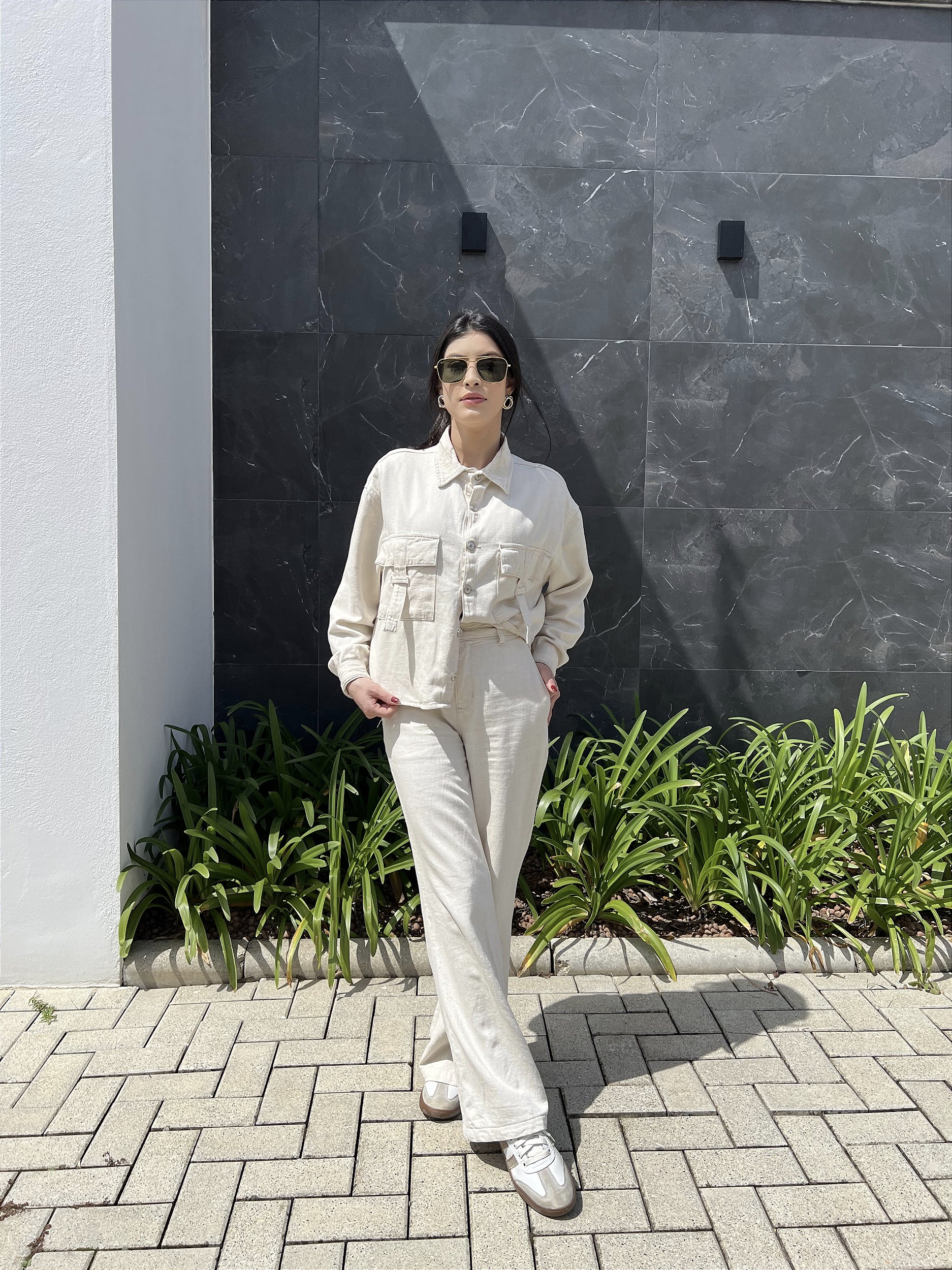 Seu design de cintura alta valoriza a silhueta, alonga as pernas e garante praticidade ao compor looks versáteis. O tom cru, neutro e atemporal, permite combinações infinitas — desde blusas leves e regatas para um visual casual, até camisas estruturadas ou tops sofisticados para produções mais formais.